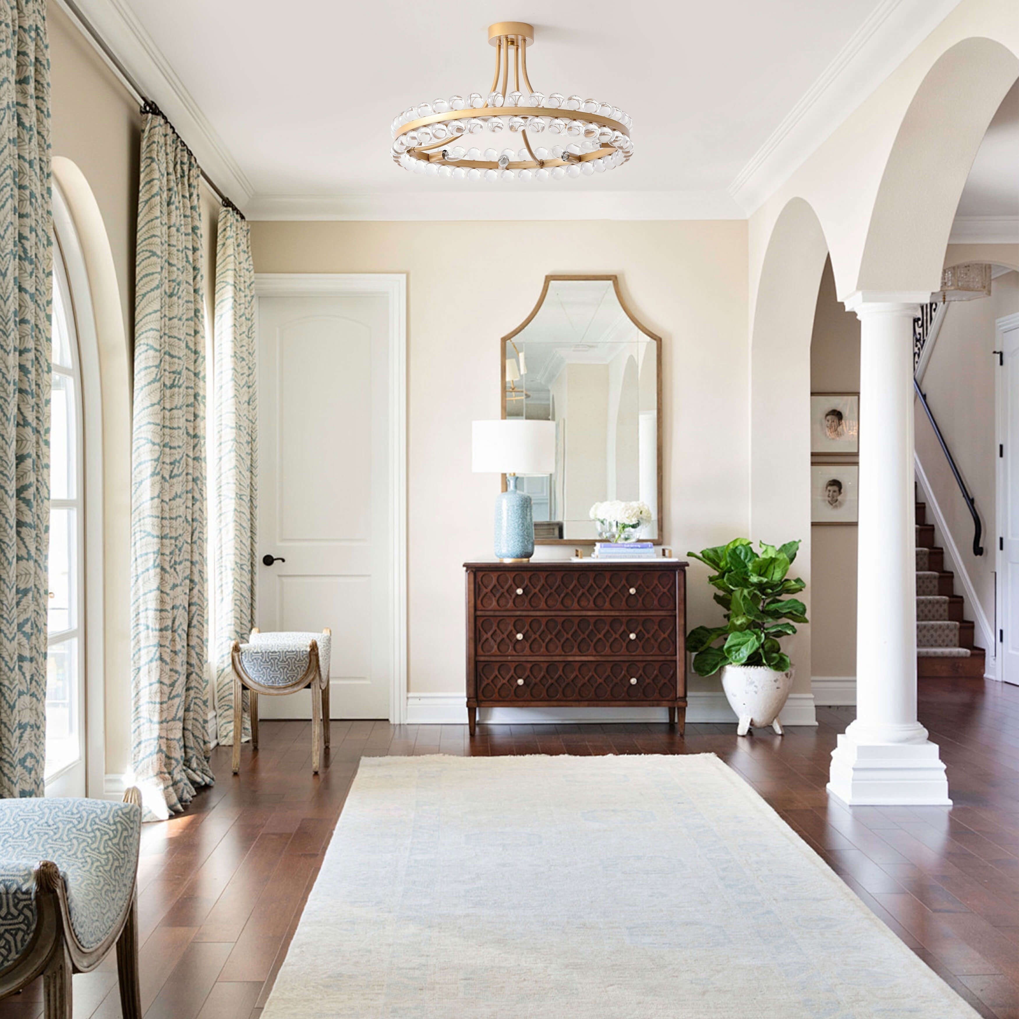 Illuminate your home with the Elvira 8-Light Wagon Wheel Crystal Semi-Flush Mount. This exquisite chandelier features an iron ring adorned with ball crystals, creating a captivating and sophisticated look.Designed for versatility, the semi-flush mount style is perfect for lower ceilings and is compatible with dimmer switches. It requires eight (8) 40-watt (E12) bulbs (not included), suitable for incandescent, halogen, or LED lighting.Enhance any space—from dining rooms to entryways—with the Elvira chandelier, a beautiful fusion of timeless elegance and modern style!