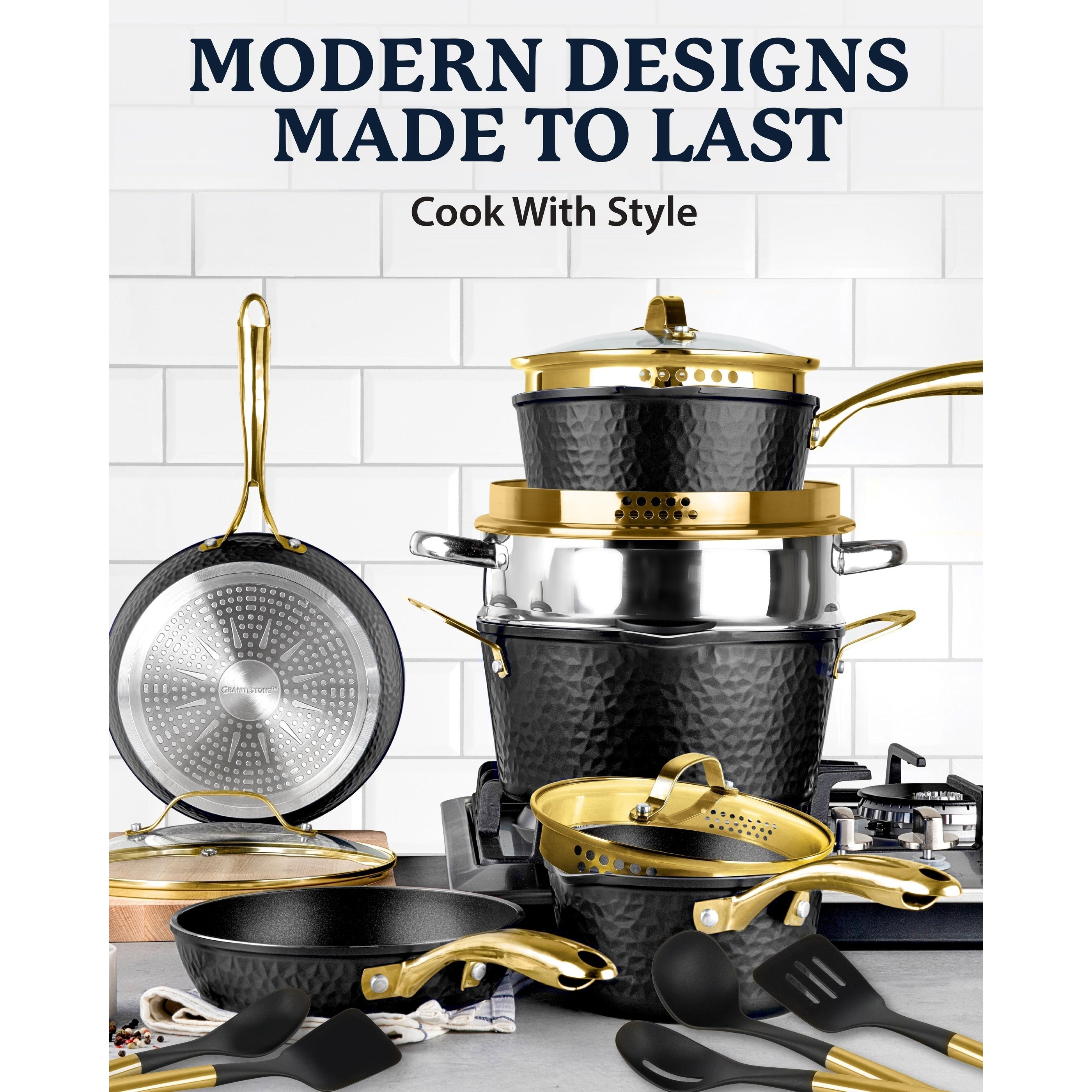 Reimagine weeknight dinners with the 10x longer lasting and ultra durable Granitestone Charleston cookware set. The 15-piece set includes a 8' fry pan, 10' fry pan with lid, 1.5-quart saucepan with lid, 2.5-quart saucepan with lid, 5-quart stock pot with lid, stainless steel steamer basket, and 5-piece utensil set. Crafted with three layers of exceptional durability with a coating that lasts 10x as long as conventional ones, this pot and pan set was made to handle your daily kitchen routines. Its nonstick surface ensures that food effortlessly glides off, while remaining easy to clean. Little to no oil or butter is needed and every piece is made without PFOA, PFOS, lead, or cadmium so they're crafted for healthier cooking goals. A dishwasher safe design that's metal-utensil safe and scratch-resistant makes cooking and cleaning a whole lot easier. Each piece has an induction base and is oven safe up to 500˚F so you can cook any way you want. Gold ergonomic handles stay cool to the touch to offer maximum comfort while cooking. To top it off, it has a modern farmhouse look with a hammered design that brings elegance and durability together.