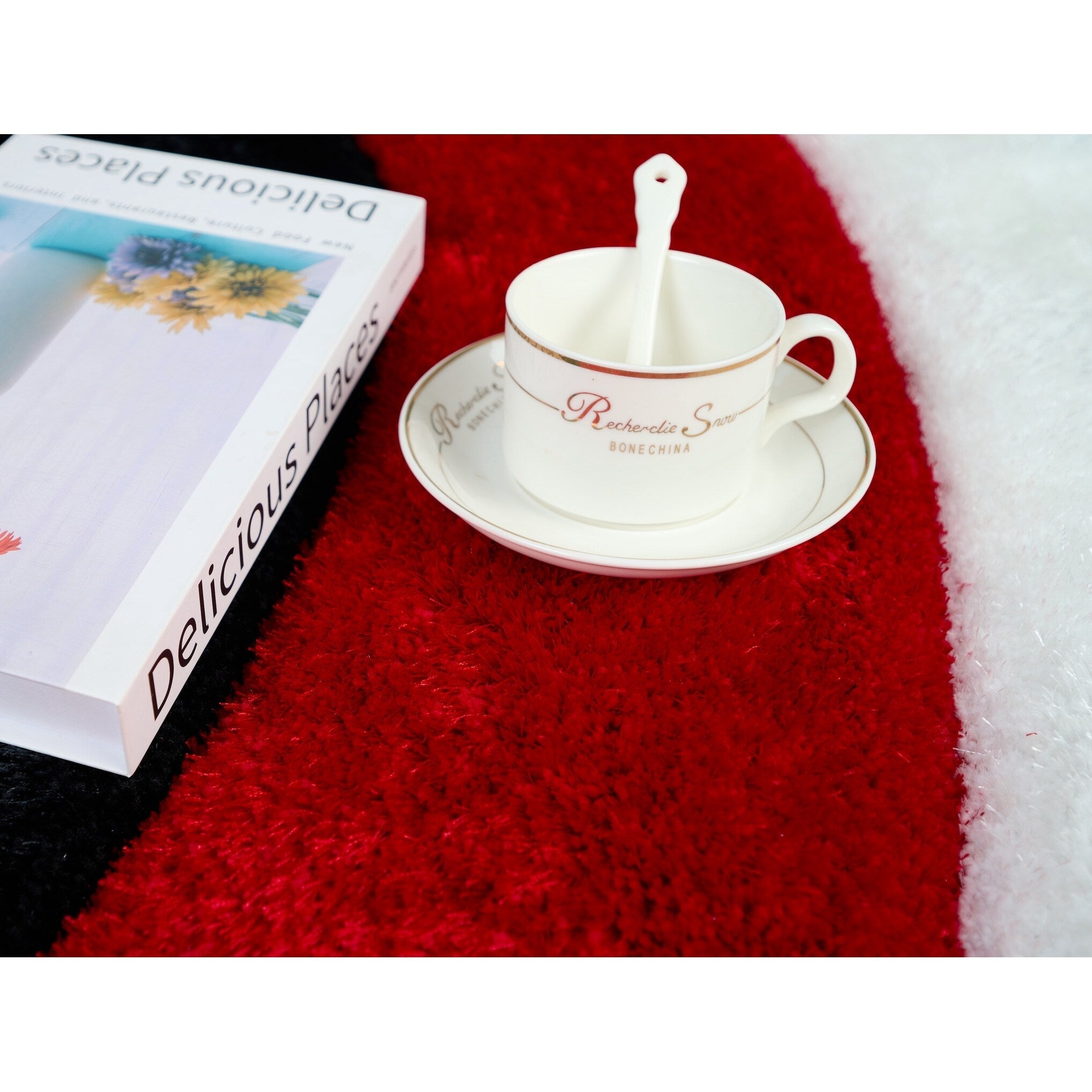 Material: 100% Polyester Backing Material: Cotton Available Colors: Black/White, Gray/Purple, Navy Blue/Gray, Black/Red, Gray/Dark Gray and Navy Blue/Tan Machine Made Construction Power Loom Technique Shag Style Rectangular Shape No Distressing