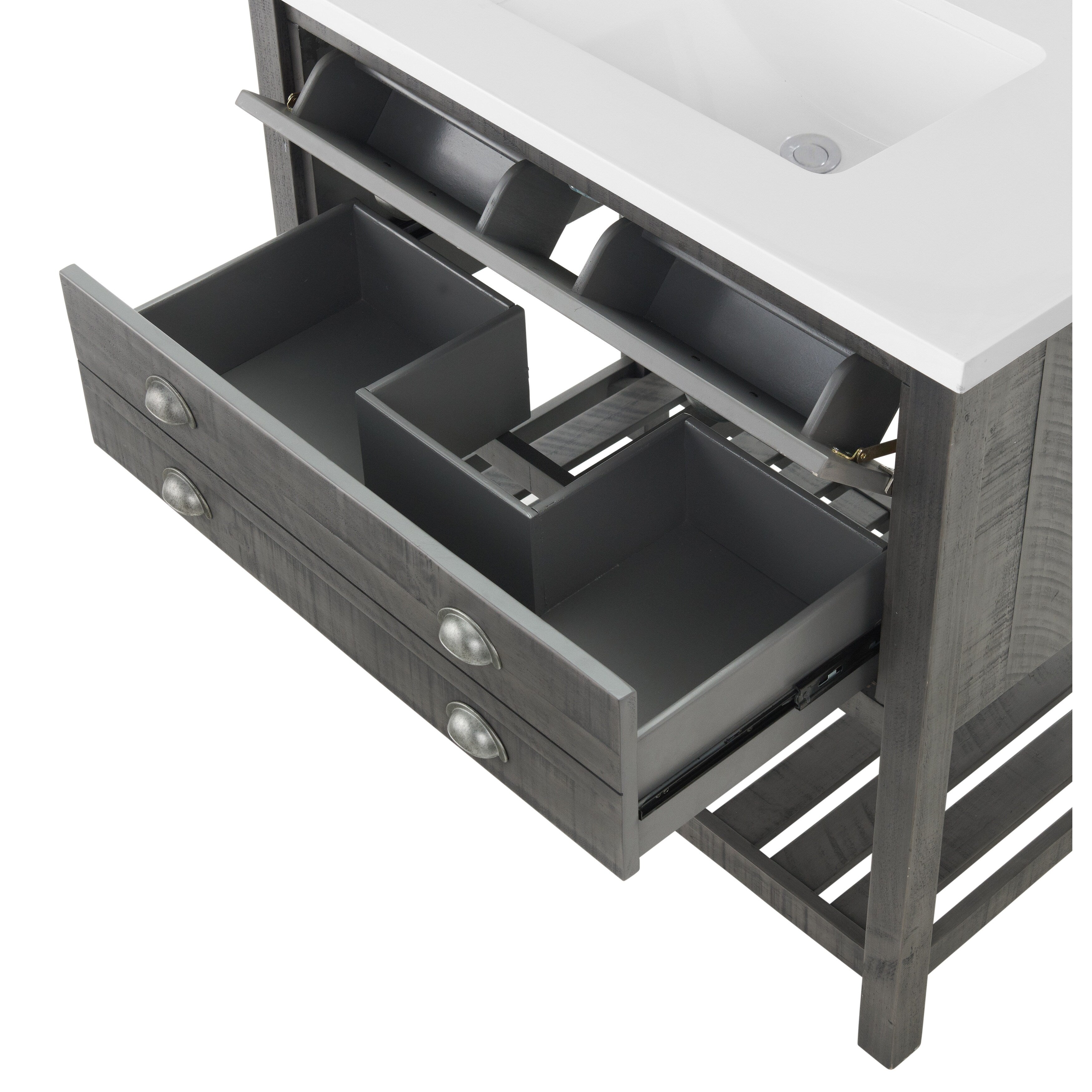 Transform your bathroom into a coastal farmhouse oasis with the Monterey 37' single bathroom vanity. Crafted from durable solid pine wood base, this single sink vanity features a solid white cultured marble top with pre-drilled holes for an 8' faucet (faucet not included). One nicely sized split drawer and a top tilt down drawer offer plenty of storage space for toiletries. A bottom slat shelf provides additional storage space for towels, linens, and other items.
