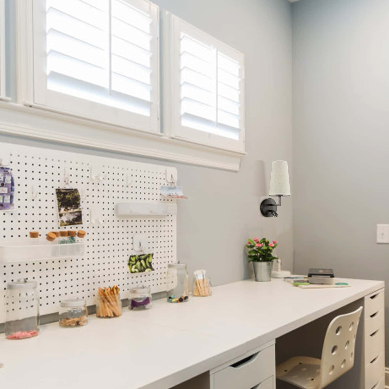 The brass gold or black wall sconce consists of round metal plate with USB charging port and bucket-shape white fabric lamp shade, creating a classic and modern charm decor in your living spaces. The switch on the left one controls LED reading light, the right one controls the E26 bulb. (Bulb Not Included)