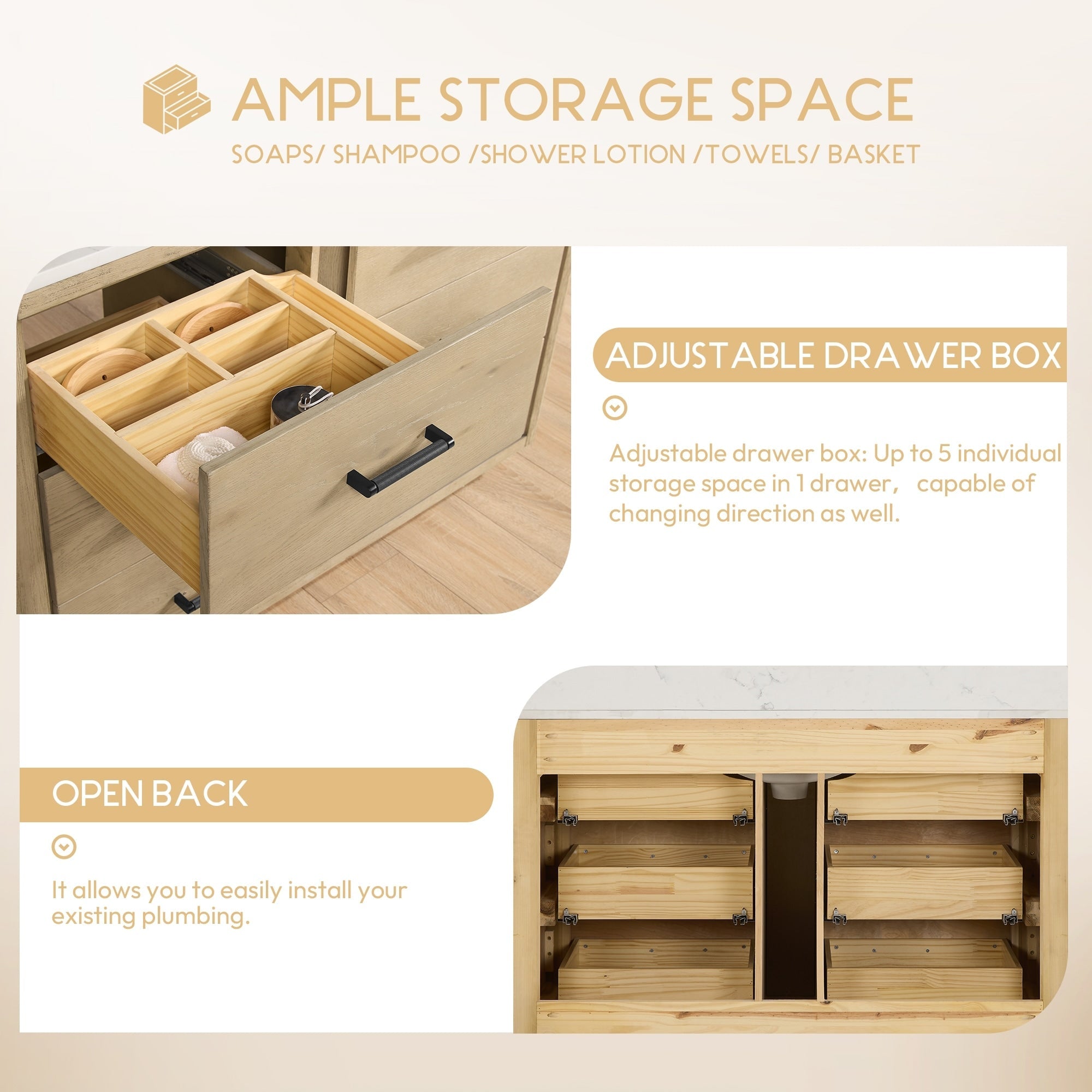 Transform your bathroom into a haven of style and sophistication with our Porto Series Freestanding Bathroom Vanity—a piece that embodies fine craftsmanship and everyday practicality. This exquisite vanity combines the textured warmth and elegance of solid oak with pristine white quartz, resulting in a look that's both inviting and visually captivating. Deep dovetail drawers with partitions allow you to keep your essentials concealed and organized.